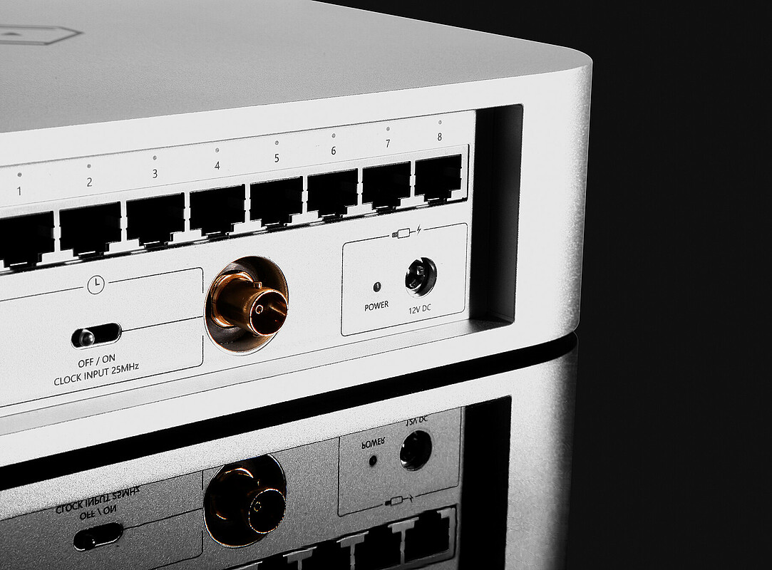 Mit acht Gigabit-Ethernet-Ports (8 × 1 GbE) bietet der Bonn N8C ausreichend Anschlussmöglichkeiten für Musikserver, Streamer, NAS-Systeme und andere Netzwerkgeräte. Die Kombination aus präziser Taktung, mechanischer Dämpfung und stabiler Stromversorgung sorgt für eine saubere und verlustarme Signalübertragung – die Grundlage für hochwertige digitale Audiowiedergabe.